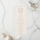 Dieses botanische und goldfarbene, minimalistische Hochzeitsprogramm der Daphne Collection ist perfekt für eine traditionelle Hochzeit. Das schlichte und dennoch klassische Design besticht durch ein elegantes und zeitloses verziertes Wappen-Monogramm mit Blumengestalten und Grünpflanzen, die die Initialen des Ehepaares umgeben. Geben Sie die Namen des Paares, das Datum und den Ort der Hochzeit, Dankeschön-Nachricht, Dienstorden, Hochzeitsfeier und ein optionales "in Loving Memory"-Denkmal ein.
