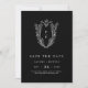 Diese klassische, dunkelschwarze klassische Hochzeit rettet das Datum aus der Daphne Collection ist perfekt für eine traditionelle Hochzeit. Das schlichte und dennoch raffinierte Design zeichnet sich durch ein elegantes und zeitloses Vintages Wappen-Monogramm aus, das mit Blumen und Grünpflanzen die Initialen des Paares umgibt.