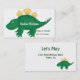 Carte de date de jeu maman mignonne faite en blanc, avec un dinosaure vert et jaune coloré décorant l'avant et l'arrière de la carte. Le texte en vert et blanc est entièrement personnalisable selon vos besoins. Super carte maman, c'est génial pour arranger des dates de jeu, avec d'autres mamans, et des coops de baby sitting.