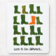 Ein hochwertiges Mousepad mit einem motivierend Slogan, "Dare to be Different", illustriert von einem hellorangen, rot-gepunkteten Stiefel zwischen Reihen ähnlicher grüner Schweißnähte. Eine handbemalte PapierCollage, die für viele Situationen geeignet ist!