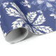A sheet of dark blue wrapping paper with a white butterfly pattern. The top image shows the paper partially unrolled; the bottom displays it flat.