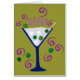 Schmutzige Martini mit Oliven und Eiswürfeln. Helle lila Spiralen und kobaltblaues Martini-Glas. Text: Hintergrund: Spiralen und Oliven auf grünem Hintergrund.
