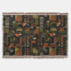 Sophisticated mid-century geometric pattern blanket featuring layered circles, arches, triangles, and rectangles in forest green, burnt orange, ochre, and cream on a black background. Rich textures and retro-modern shapes create a bold design ideal for Bauhaus lovers, vintage décor fans, and anyone drawn to moody modern style.