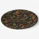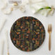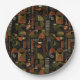 Sophisticated mid-century geometric pattern paper plate featuring layered circles, arches, triangles, and rectangles in forest green, burnt orange, ochre, and cream on a black background. Rich textures and retro-modern shapes create a bold design ideal for Bauhaus lovers, vintage décor fans, and anyone drawn to moody modern style.