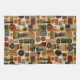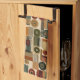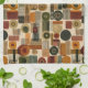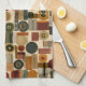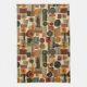 Sophisticated mid-century geometric pattern kitchen towel featuring layered circles, arches, triangles, and rectangles in forest green, burnt orange, ochre, and cream on a black background. Rich textures and retro-modern shapes create a bold design ideal for Bauhaus lovers, vintage décor fans, and anyone drawn to moody modern style.