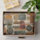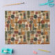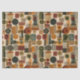 Sophisticated mid-century geometric pattern tissue paper featuring layered circles, arches, triangles, and rectangles in forest green, burnt orange, ochre, and cream on a black background. Rich textures and retro-modern shapes create a bold design ideal for Bauhaus lovers, vintage décor fans, and anyone drawn to moody modern style.