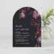 This elegant dark moody floral wedding invitation features purple and red peony flowers on a black background. Dark romantic aesthetic wedding invitation.