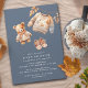Jolie invitation à la douche bébé d'automne avec aquarelle illustrations d'un ours en peluche et des vêtements de bébé douillets. Disposition simple avec police blanche sur un arrière - plan bleu foncé. Le design neutre est parfait pour un bébé garçon ou une petite fille.