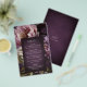 Elegant wedding menu flyer featuring a dark purple floral theme. The moody color palette is great for a fall wedding.