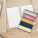 A colorful striped notebook with a dark purple background and text that reads "NOTES" and a custom monogrammed full name.