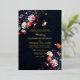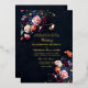 Ein wunderschönes Blumengesteck umrahmt diese atemberaubende Hochzeitseinladung mit einem düsteren romantischen Thema. Ein dunkler mariner Hintergrund mit schwarzen Untertönen ist die Leinwand für klassische Typografie und Touchs eleganter Kalligraphie in Goldfolie (reale Goldfolie). Eine perfekte Wahl für Paare, die die dunkle romanische Hochzeitsvibe und Hochzeitskunst mit einem Gemäldedesign im Stil alter holländischer Meister Liebe haben. Eine dunkle und launische Hochzeitseinladung, die jede Menge Farbe verleiht und eine große Auswahl an Farben bietet, um einem schwarzen Hochzeitskleid oder einer dunkelblauen Hochzeit zu entsprechen. Elegant und romantisch, ist dies eine moderne klassische Hochzeitseinladung.