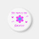 Dieses Bild zeichnet sich durch ein fröhliches und farbenfrohes Design aus, mit der Phrase "Meine Mutter ist die Bestste", geschrieben in leuchtend rosa stilisierten Schriftart. In der Mitte befindet sich eine niedliche Blume mit rosa Blütenblättern und einem blauen kreisförmigen Gesicht, das mit einem herzlichen Lächeln und den Wangen-Erröten behaglich wirkt. Um die Blume herum sind zwei rosa Schmetterlinge und zwei rosa umrissene Herzen, die eine spielerische und liebevolle Touch hinzufügen.