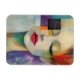 Dieses atemberaubende abstrakte Frauenportrait verbindet Surrealismus mit lebendigen Farbblocktechniken. Ihr ruhiger Ausdruck, geschlossene Augen und fette rote Lippen sind durch eine Mischung geometrischer Formen und malerischer Texturen gerahmt. Ein modernes, avantgardistisches Design, das eine Touch moderner Eleganz ergänzt.