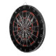 Dartboardentwurf mit als Hintergrund ein unheimliches Schauen, ruhiges ein Gesicht des verwickelten, silbernen Graus oder ein Schädel oder eine Maske, mit Rot, piercing Augen, auf Schwarzem. Alle Betten des Dartboard sind sichtbar und von einander durch einen dünnen, Weißglühen um jedes von ihnen. getrennt. Die traditionellen Farben des Rotes und des Grüns sind durch… Rot und Schwarzes ersetzt worden.