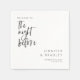 Minimalistisches Hochzeitsessen Probe Begrüßung Serviette mit handgeschriebenem Schriftzeichen, in dem steht: "Willkommen in der Nacht zuvor".