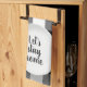 Weiße Tafel mit Silberbesteck auf dem Bauernhof, kariertes Büffelmuster in Weiß und Schwarz und "lasst uns Zuhause bleibe" Text. Text ist bearbeitbar.