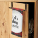 Weiße Tafel mit Silberbesteck auf rotem und schwarzem Büffel kariert und "lasst uns Zuhause bleibe" Text. Text ist bearbeitbar.
