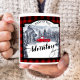 Herrliches Geschenk! Rustikale Tasse zeigt den Satz "Und so beginnt das Abenteuer" in Blockschrift und handgeschriebene Schrift-Typografie, Buffalo Kariert in rot und schwarz karierten Mustern und exquisite Wasserfarben Berg- und Waldlandschaft mit Vintagem roten LKW.