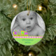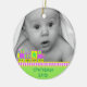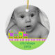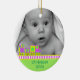 Der erste Weihnachtsschmuck des süßen Babys aus einer runden Keramik mit hübschem Goldschnur. Grafik eines farbenfrohen Neon-ähnlichen Farbspielzeugzuges, der an einen hellgrünen Hintergrund grenzt, am unteren Ende des Ornaments, und ein individuelles Foto, oben auf dem Ornament. Grüner Text im unteren Bereich und auf der Rückseite ist vollständig anpassbar. Personalisieren Sie den gesamten Text und das Foto Ihres Babys, für ein süßes erstes Weihnachtsfest oder als ein hübsches Geschenk für die neuen Eltern oder Großeltern.