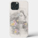 Das ist ein wunderschönes iPhone-Gehäuse mit dem Gesichtsprofil einer Frau in gedämpften Tönen und farbigen Blume in ihren Haaren. Das Design hat ein Einlegeüberlagerungen, die dem Gehäuse einen strukturierten Effekt und Vintages Gefühl verleihen.