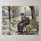 Hochwertiges Poster mit Aquarellbild-Reproduktion der Parkszene. Das Long Await zeigt einen gut aussehenden Mann auf einer Parkbank, der auf die Ankunft von jemandem wartet. Er biegt seine Zeit noch hoffnungsvoll ab, während er Tauben in einer trostlosen Umgebung füttre.