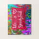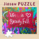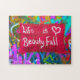 Relaxtes Puzzling - Dieses einzigartige Graffiti-Foto zeigt einen weißen Text auf einem roten Rechteck "Life is Beauty Full" auf einer bunten Graffiti-Wand. Es ist ein fröhliches Stück Street Art.
