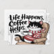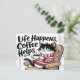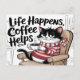 Eine charmante Abbildung einer niedlichen Katze, die aufrecht sitzt und eine warme Tasse Kaffee mit beiden Pfoten hält. Die Katze hat einen entspannten, inhaltlichen Ausdruck, als würde sie den Moment genießen, mit Dampf, der sanft aus der Tasse steigt. Im Hintergrund erwartet Sie ein gemütliches Café-Ambiente mit sanfter, warmer Beleuchtung. Der Satz "Leben passiert, Kaffeehilfen" wird in elegantem, spielerischem Schriftart hervorgehoben dargestellt, und fügt sich perfekt in die Szene ein, was die beruhigende Botschaft verstärkt. Das Gesamtgefühl des Bildes ist gemütlich und beruhigend, was das Wesen einer perfekten Kaffeepause einnimmt.