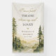 Personalisiertes Hochzeitsbanner zeigt ein lässiges naturfarbenes Design inklusive eines einfachen Wasserstroms, umgeben von Waldkiefern und Bergen in Erdtönen von Salbei, Grün und Bräune. Es enthält das Lied der Bibel Verse von Solomon 3:4, "Ich habe den gefunden, den mein Soul Liebe." Passen Sie die Tapisserie mit Namen und Datum an.