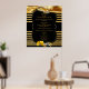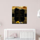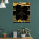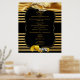 Eine luxuriöse, schimmernde goldene Seidenstruktur, die durch zwei Hochzeitsringe auf einem dramatischen schwarzen Hintergrund mit einem Streifen im Deko-Stil gezogen wird, um dem Design einen eleganten und glamourösen Look zu verleihen, der ein Menü-Poster individualisiert