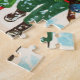 Frohe Weihnachtspuzzle mit einem sehr hellen und farbenfrohen Weihnachtsbild, das einen seiner Jugend erinnert, wie wir glückliche, fröhliche Kinder sehen, die den Weihnachtsbaum nach dem Schneiden im Wald wieder auf Zuhause bekommen.