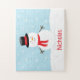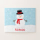 Diese Puzzlespiele machen große Weihnachtsgeschenke oder -kleine Geschenke! Dieses personalisierte Puzzlespiel kennzeichnet einen festlichen Feiertag Snowman mit einem roten Schal. Der Hintergrund ist mit fallenden Schneeflocken hellblau.