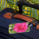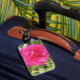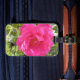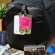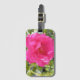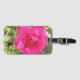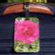 Eine Gepäckmarke mit einem Bild einer rosa Rose darauf.