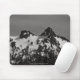 Ein Schwarz-Weiß-Foto von zwei Gipfeln in der Tatoosh Range, bekannt als The Castle and The Pinnacle. Die Bergkette ist schneebedeckt, obwohl es Sommer ist. Es gibt Bäume und Steine, die über die Landschaft und die Berge verstreut sind. Die Lage der Sonne erlaubt es, Schatten auf den Berg zu werfen. Inkognito Wolken ziehen den Himmel an. Image Copyright ©2023 Kimberly J Tilley. zazzle.com/store/developingnature