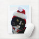 Eine Schwarzweiss-Katze tragende Blicke eines Sankt-Weihnachtshutes verlassen in diesem niedlichen Weihnachtsbild.