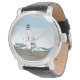 Dieser zeichn ist mit einem weißen, grünen und schwarzen Leuchtturm ausgestattet, der das Meer überragt. Der Himmel ist blau mit ein paar Wolken. Weiße Häuser mit grünen Dächern umgeben den Leuchtturm. Dieses Design ist für Frauen, Männer und Kinderuhren erhältlich.