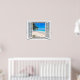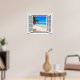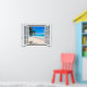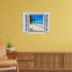 3D-Blick auf den tropischen Strand und den Ozean, Fake-Fensterszene, für eine fensterlose Bürowand. Spaß, realistische optische Täuschung landschaftliches Poster für ein Büro oder eine Studiowand.