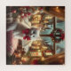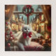 Weißes Kätzchen mit rotem Bogen, posiert in der Nähe des Fensters eines Hauses zwischen Weihnachtsdekorationen. Im Hintergrund fällt nachts eine Weihnachtsdörfstrasse mit Schnee.