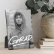 Feiern Sie die Leistung Ihres Absolventen mit einem personalisierten Abschluss Foto-Sake. Die Tafel zeigt das vertikale Foto des Absolventen mit "Grad" in weißer handgeschriebener Schrift mit einem Bindestrich unten. Personalisieren Sie die Abschluss-Foto-Plakette, indem Sie den Namen, Schule und Abschluss Jahr.