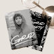 Die trendige, moderne Graduiertenparty lädt mit dem vertikalen Senior Foto des Absolventen in weißer Schrift "Grad" ein, unten mit einem Kontrast. Personalisieren Sie die Einladungen der Foto-Graduiertenparty, indem Sie den Namen des Absolventen, den Namen der Schule und das Jahr des Abschlusses hinzufügen. Die Einladung kehrt zurück, um Ihre Graduierungsparty Details mit einem Hintergrund von schwarz-weiß gestrichelten Pinselstrichen anzuzeigen.