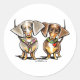 Zwei piebaldgedeckte Dackeln mit stylischen Herzkragen und rosa Tarngurten. Original Illustration von Andie von Off-Leash Art.