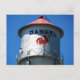 Alter Wasserturm mit rotem Hahn auf der Seite.