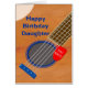 Eine Geburtstagskarte für eine Tochter, die die Gitarre Liebe. Ein nahes Aufsetzen einer Gitarre mit einem Plectrum in den Saiten. Auf dem Spektrum sind die Worte 'You Rock'. Eine Geburtstagskarte für einen Musiker, der die Gitarre Liebe.