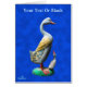 Eine gemalte, geschnitzte Holzente mit ihrem Enkeln, stark verwittert, auf blauem Hintergrund. Fügen Sie Ihren eigenen Text hinzu.