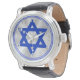 Die Vintage, schwarze Trageuhr mit dem Bild eines königsblauen David-Star und einer königsblauen Doppelrandung auf glänzendem Silber. Optionale Silber-Uhr-Oberfläche. Sehen Sie dazu die passende Vierkanttaste, die runde Taste, den runden Charme, den großen runden Premium Metal Schlüsselanhänger und die runde Halskette. Sehen Sie sich die gesamte Hanukka Watch-Sammlung unter der Rubrik ACCESSORIES im Bereich HOLIDAYS an.