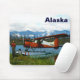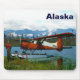 Ein Buschpilot steht in der Nähe seines DHC-2 Biber-Schwimmfliegers de Havilland Canada am Ufer eines Sees im Norden; Berge und Bäume sind in der Ferne. Es erscheint auch das Textlesen "Alaska". Dieses Bild wurde teilweise von einem US Fish and Wildlife Service Foto abgeleitet.