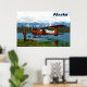 Ein Buschpilot steht in der Nähe seines DHC-2 Biber-Schwimmfliegers de Havilland Canada am Ufer eines Sees im Norden; Berge und Bäume sind in der Ferne. Es erscheint auch das Textlesen "Alaska". Dieses Bild wurde teilweise von einem US Fish and Wildlife Service Foto abgeleitet.