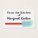 En utilisant le carte de visite (un peu régulier et un peu bavard), je conçois des cartes que j'ai toujours aimé avoir à portée de main : 1. Cartes de boîtier cadeau pour se brancher dans des cadeaux ou des paniers cadeaux, et 2. Cartes "DE LA CUISINE DE" pour faire de même lorsque vous donnez à quelqu'un quelque chose de spécial de votre cuisine. Ils sont tous deux une touche de classe, et j'ai toujours eu de bons commentaires sur les cartes de mes destinataires. Avant Zazzle, je les commandais à une société très chère. J'agis même un joint avec mon monogramme pour aller sur le tissu ou l'enveloppe plastique. Je serai heureux de vous dire où j'ai eu ça. La façon dont je le vois est que si je vais donner un beau cadeau ou passer du temps à faire la cuisson, il vaut la peine de l'envelopper avec une touche spéciale de finition, alors ... s'amuser avec! Consultez les différents stocks de papier pour votre préférence et le prix! Merci, Sharon Rhea Ford (www.zazzle.com/sharonrhea*)