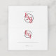 Ce design présente un arrangement élégant mais simple des initiales personnalisées de la mariée et du marié. Les noms des couples sont encerclés d'une bague noire et placés sur les initiales du prénom de la mariée et du marié qui sont affichées en typographie rouge. Ce design rouge, noir et blanc est simple mais élégant dans tous les sens. Le verso affiche le même monogramme avec la date du mariage. Le mélange des couleurs crée un style chic, tendance et sophistiqué. Design élégant de carte de lieu de mariage avec des éléments modernes. La configuration simple de la typographie lui donne un style distinct. Des invitations de mariage et d'autres articles de papeterie sont également disponibles. Facile à personnaliser avec vos détails. Ecrivez à la main vos noms d'invités et numéro de table dans l'espace prévu à cet effet.