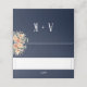 Carte mariage bleu foncé, avec fleurs d'abricot aquarelle et feuillage de jardin. Espace sur le devant pour écrire le nom de l'invité, et une section modifiable à l'intérieur pour votre message customisé. Un design botanique contemporain simple mais élégant, inspiré du style boho vintage.