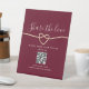Elégant, simple rouge bordeaux Partager Le mariage d'amour signe de table de code QR avec faux coeur de corde or et script de calligraphie moderne.